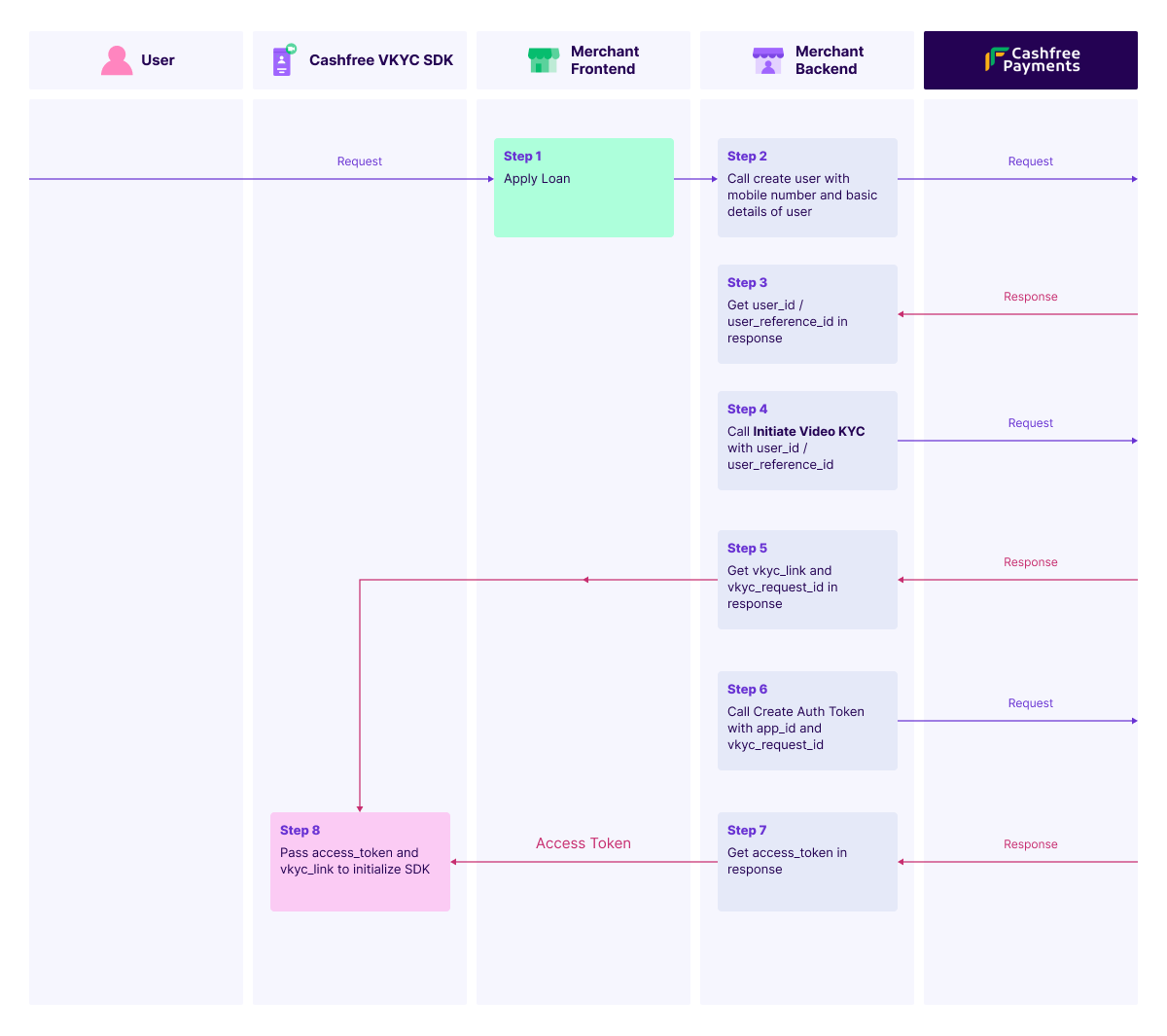 Refer to the steps below for the VKYC flow for SDK:- Create the user using the Create User for Secure ID Suite API. You must complete this step before initiating the VKYC session.