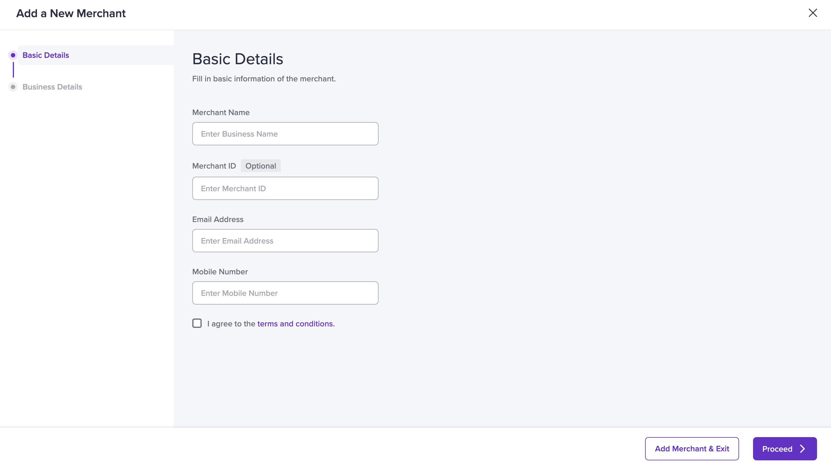 Click Add Merchant & Exit or click Proceed to enable faster onboarding and KYC verification by submitting the merchant’s basic KYC details.