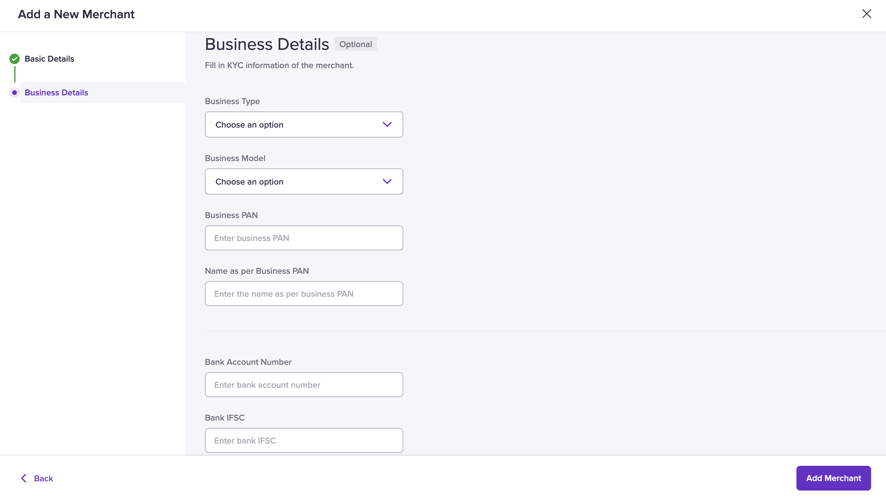 - On the Add a New Merchant screen, under Basic Details, fill in the merchant’s information: