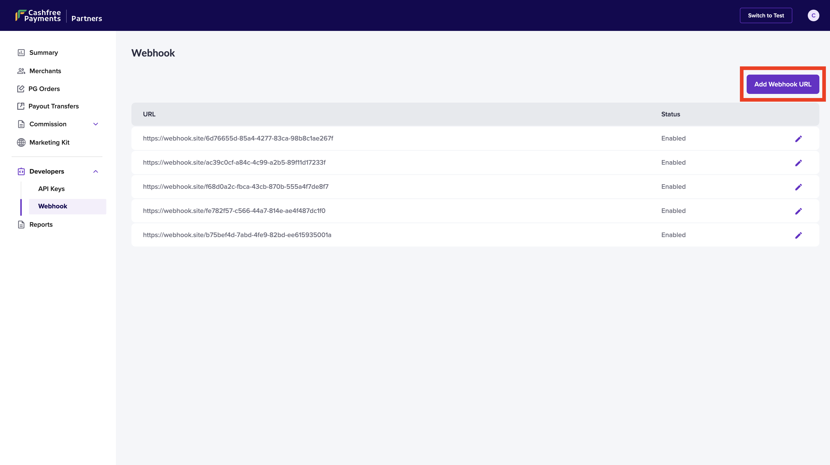 To configure partner webhook,- Go to Partner Dashboard > Developers > Webhooks.