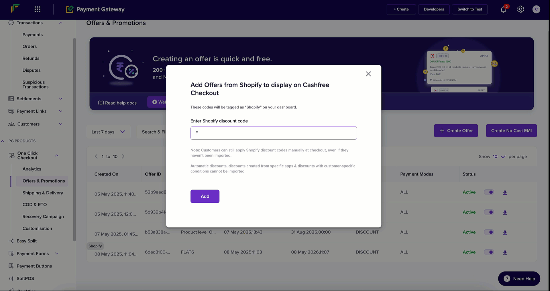 Merchants can highlight specific offers directly on the checkout page to increase visibility and conversions. Importing Shopify offers: To import Shopify offers, follow the below steps:- Create offers in Shopify and ensure each has the Cashfree sales channel added.