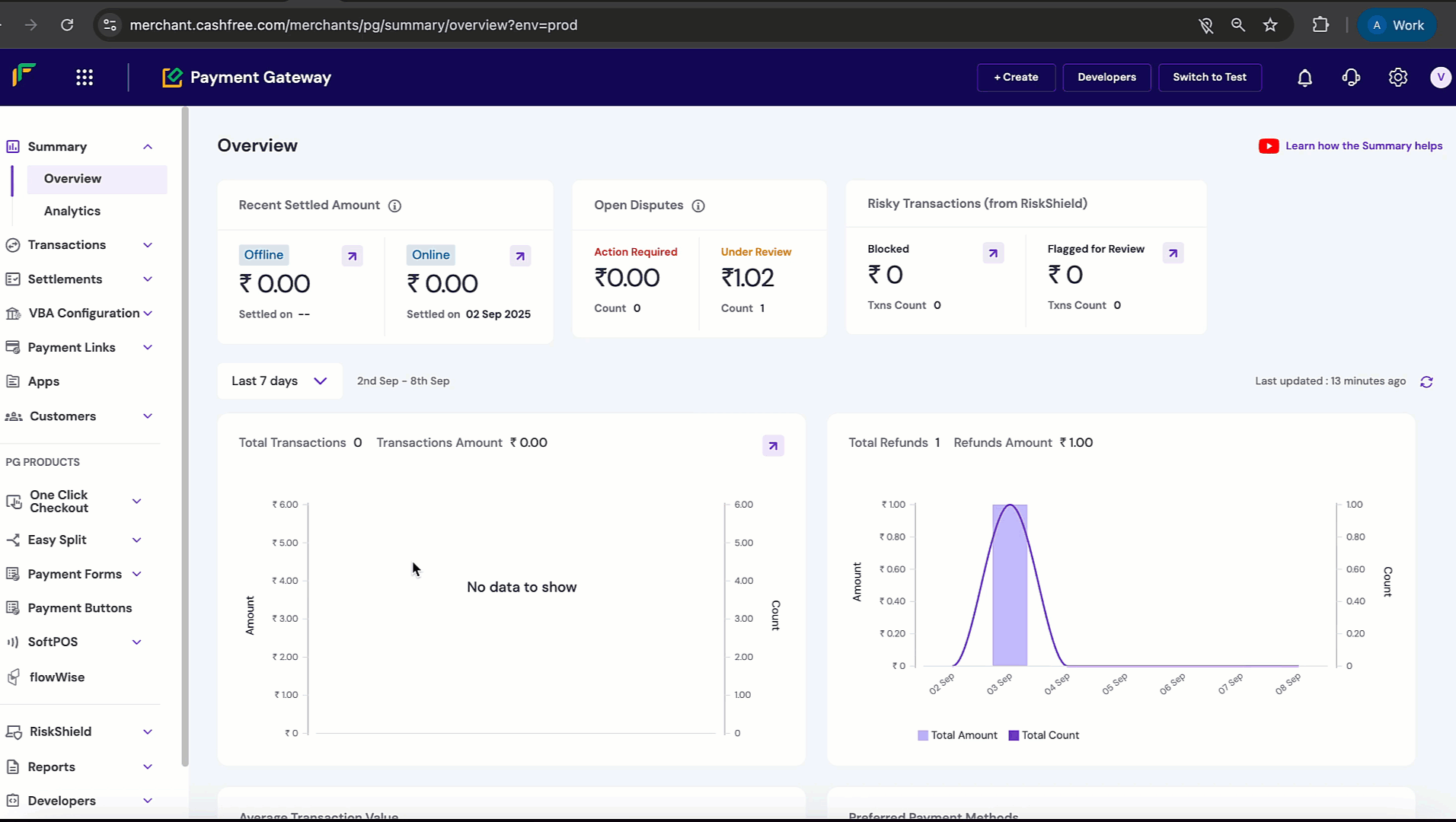 - Summary: Provides a summarized view of all the settlements received from Cashfree Payments for the selected time period. It includes details like total transaction amount, settlement amount, adjustments, UTR, settlement type, and charges.