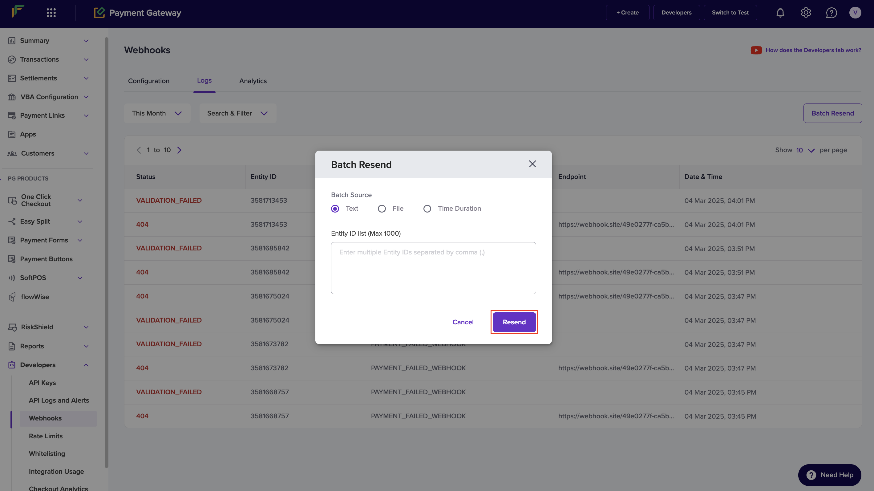 - Select the batch source and enter entity IDs in the Batch Resend modal.
