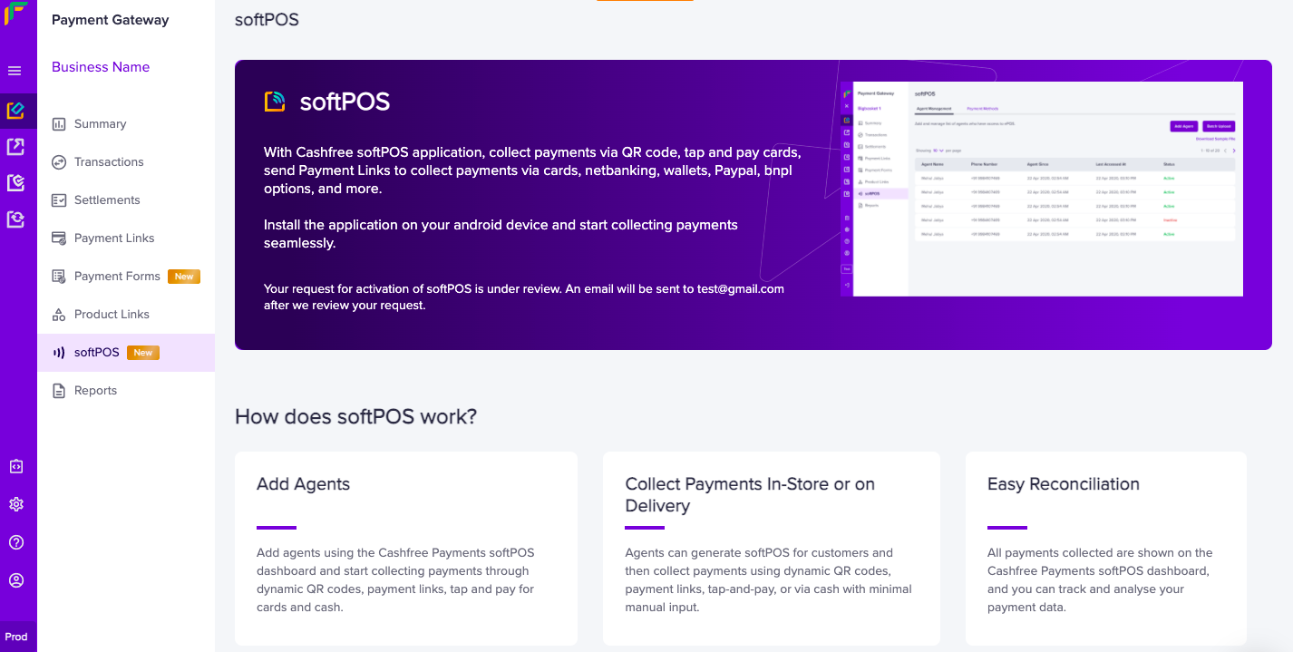 To use the SoftPOS application, ensure you have signed up with Cashfree Payments and your Payment Gateway account is active. To activate softPOS,- Go to Payment Gateway Dashboard > click softPOS. You will see a screen as shown below: