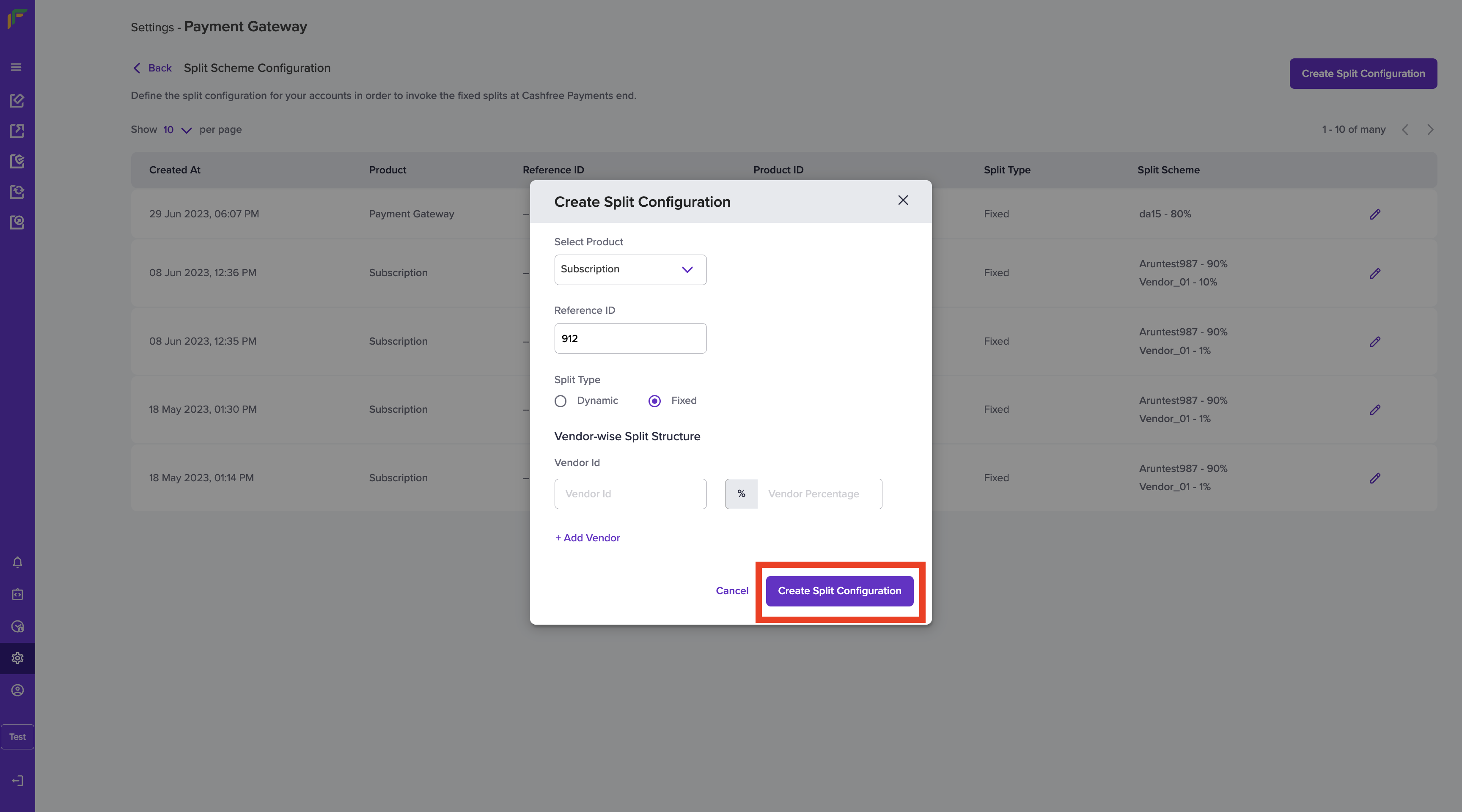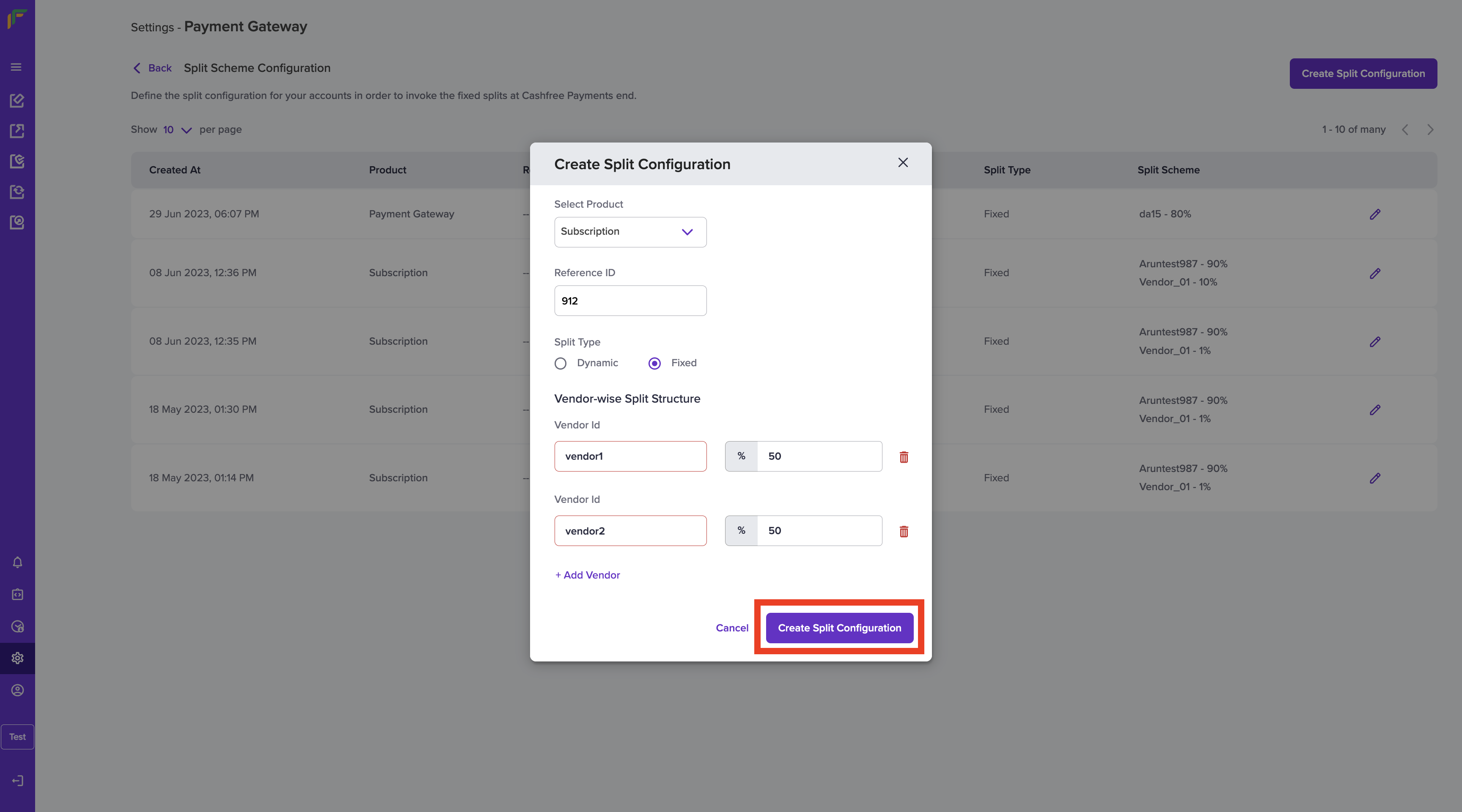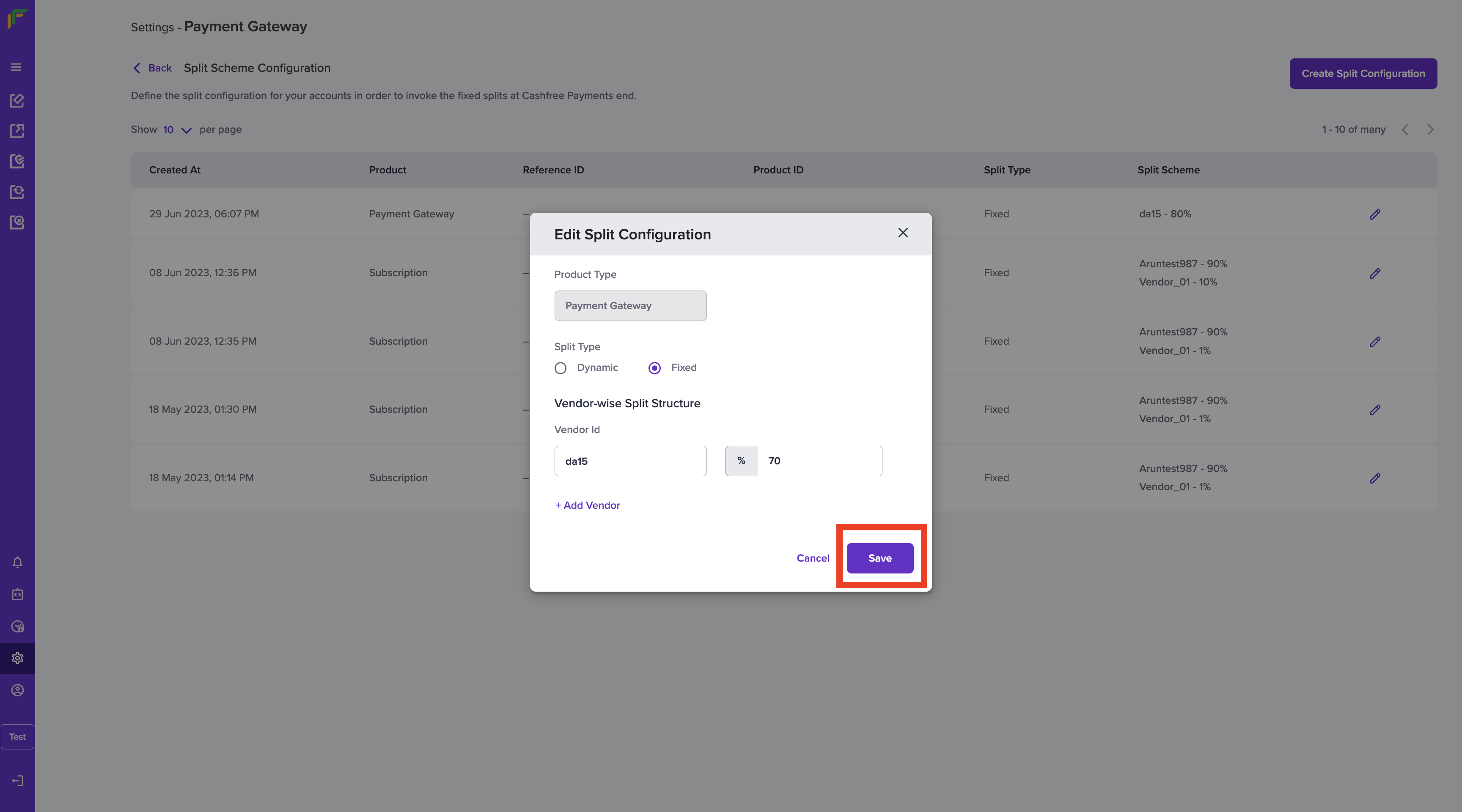 You can edit a created split scheme configuration from the homepage. Click the Edit icon on the configuration you want to edit. You can edit the split type and the commission percentage. You can also add new vendors or remove existing vendors from your scheme. Once done editing the split configuration, click Save.Any changes done to the split scheme configuration will make the existing