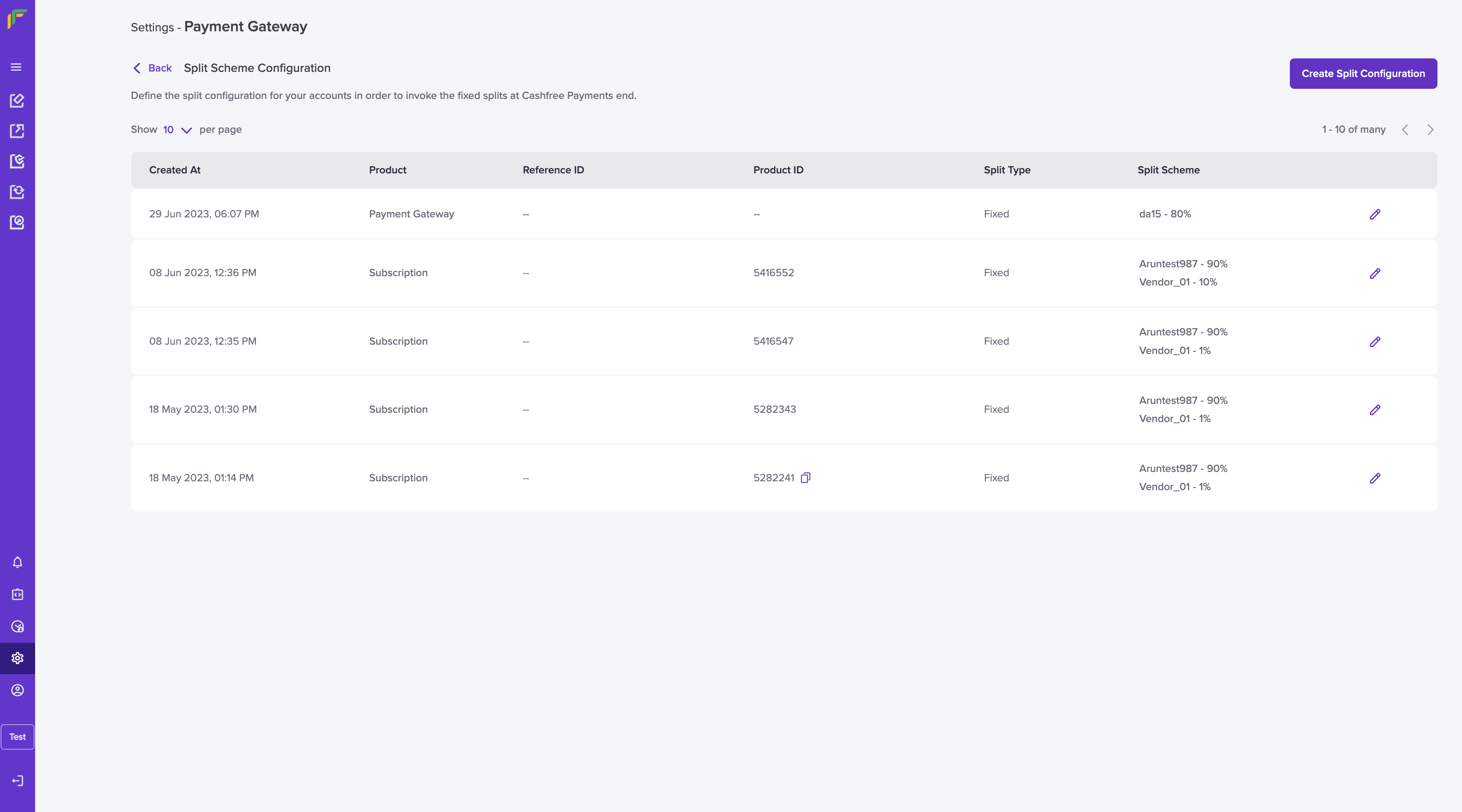 - Go to Payment Gateway Dashboard > Settings > Split Scheme Configuration. All the splits schemes you have created will be displayed on this page along with the other details such as: