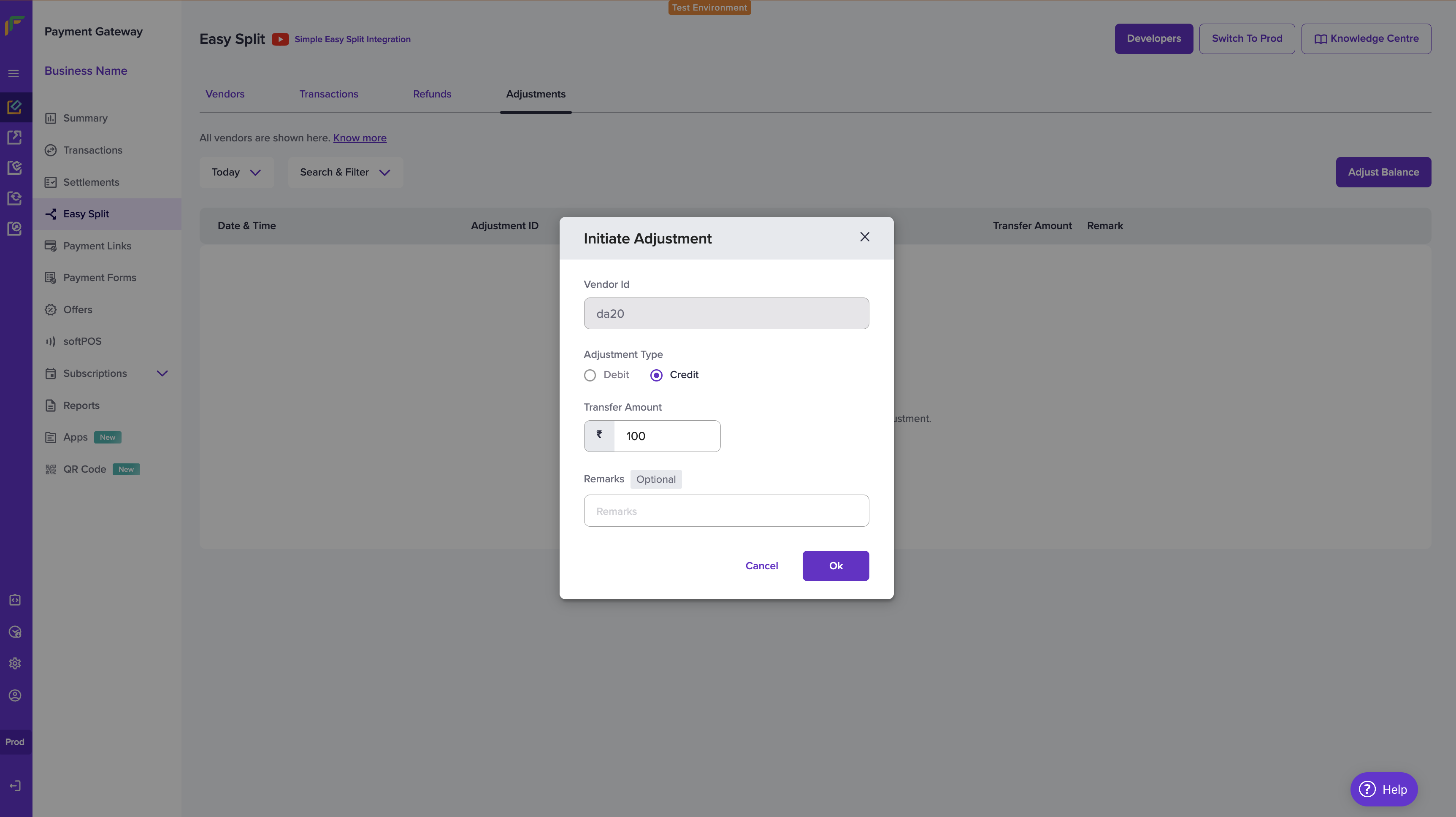 - Go to Payment Gateway Dashboard > Easy Split > Adjustments. Click the Adjust Balance option.
