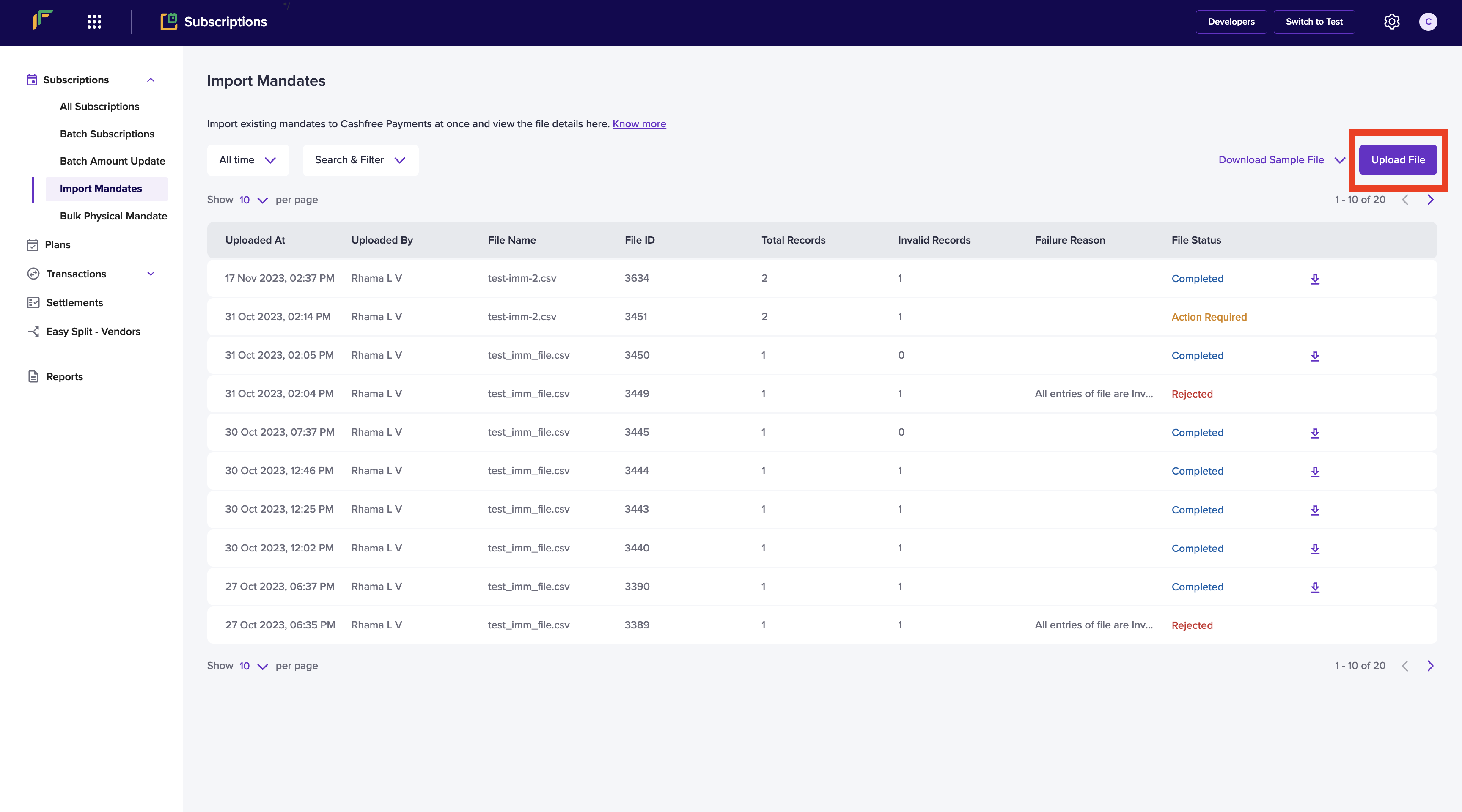 To import the mandates, you must upload the file with all the details in the NPCI file format or in the Cashfree-specified format. Once the file is uploaded, you can check the status of the import by downloading the mandate file. The file also includes the reason for rejection for cases where Cashfree is unable to import the mandate.