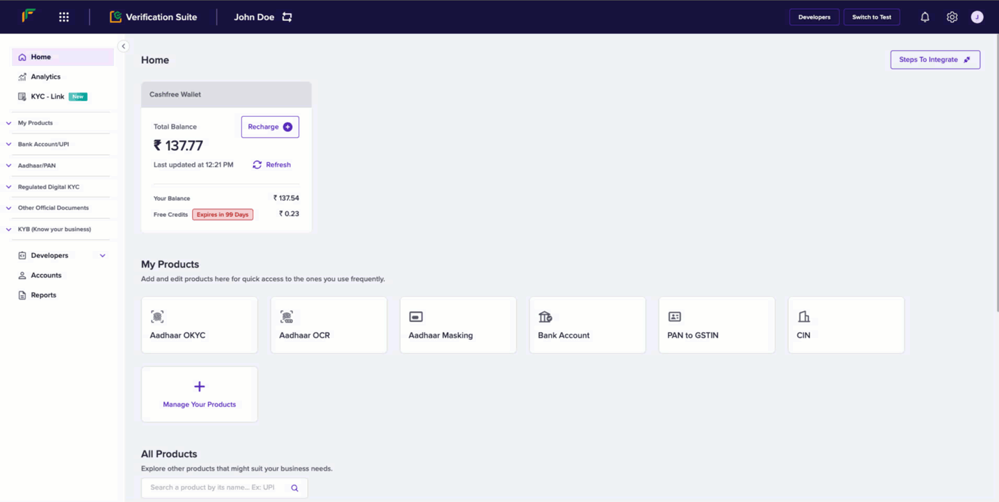Follow these instructions to view the account details of your Cashfree Wallet:- Log in to your Secure ID dashboard using your credentials.