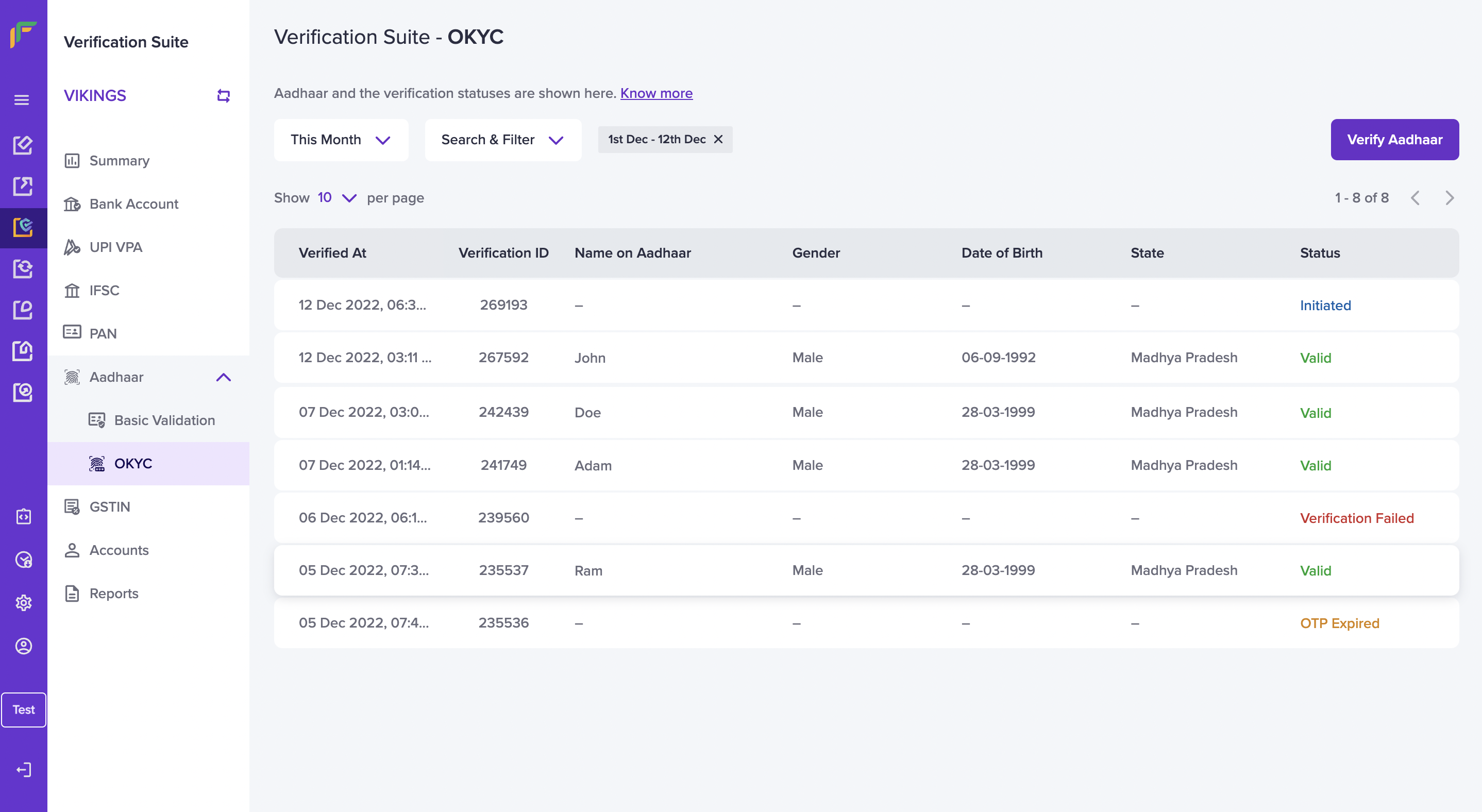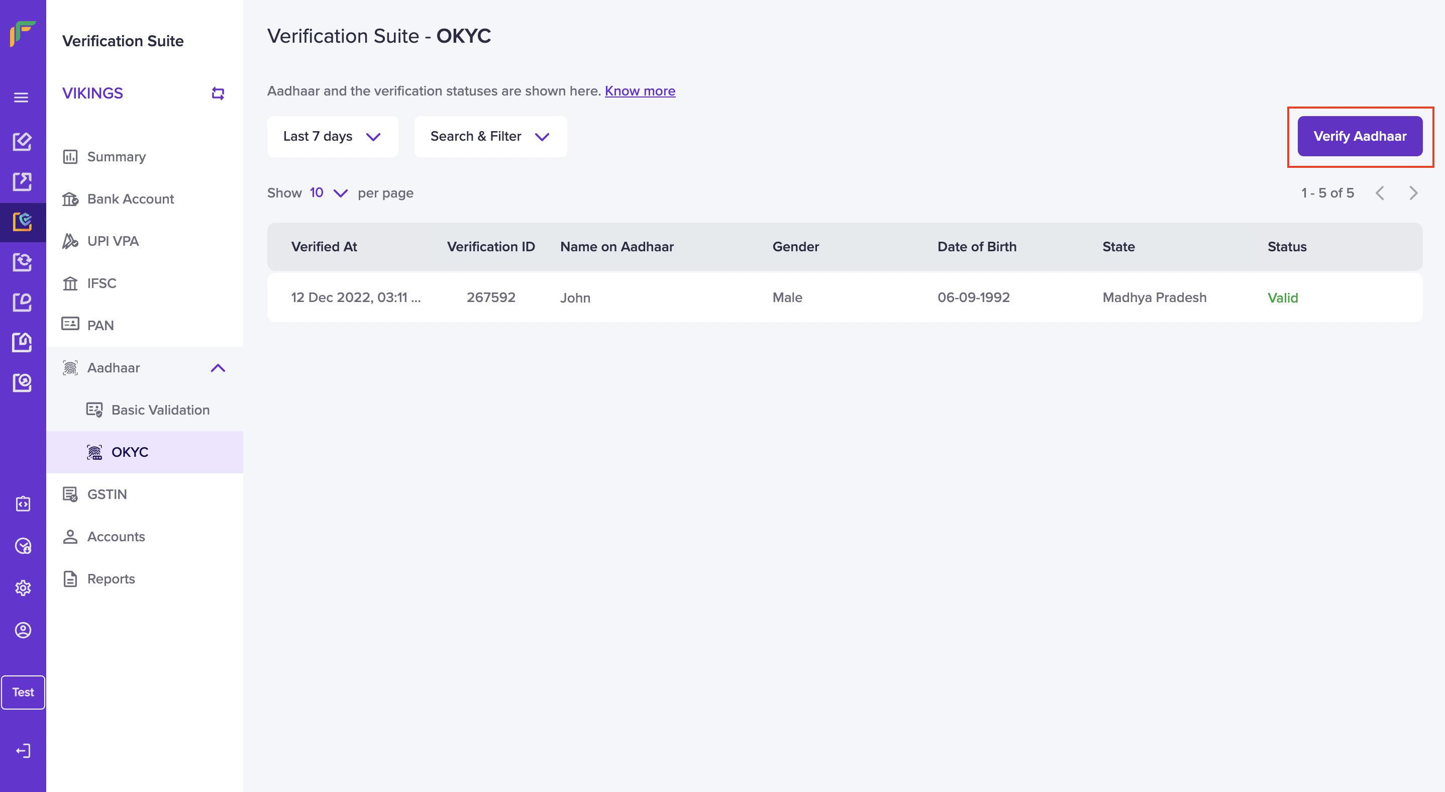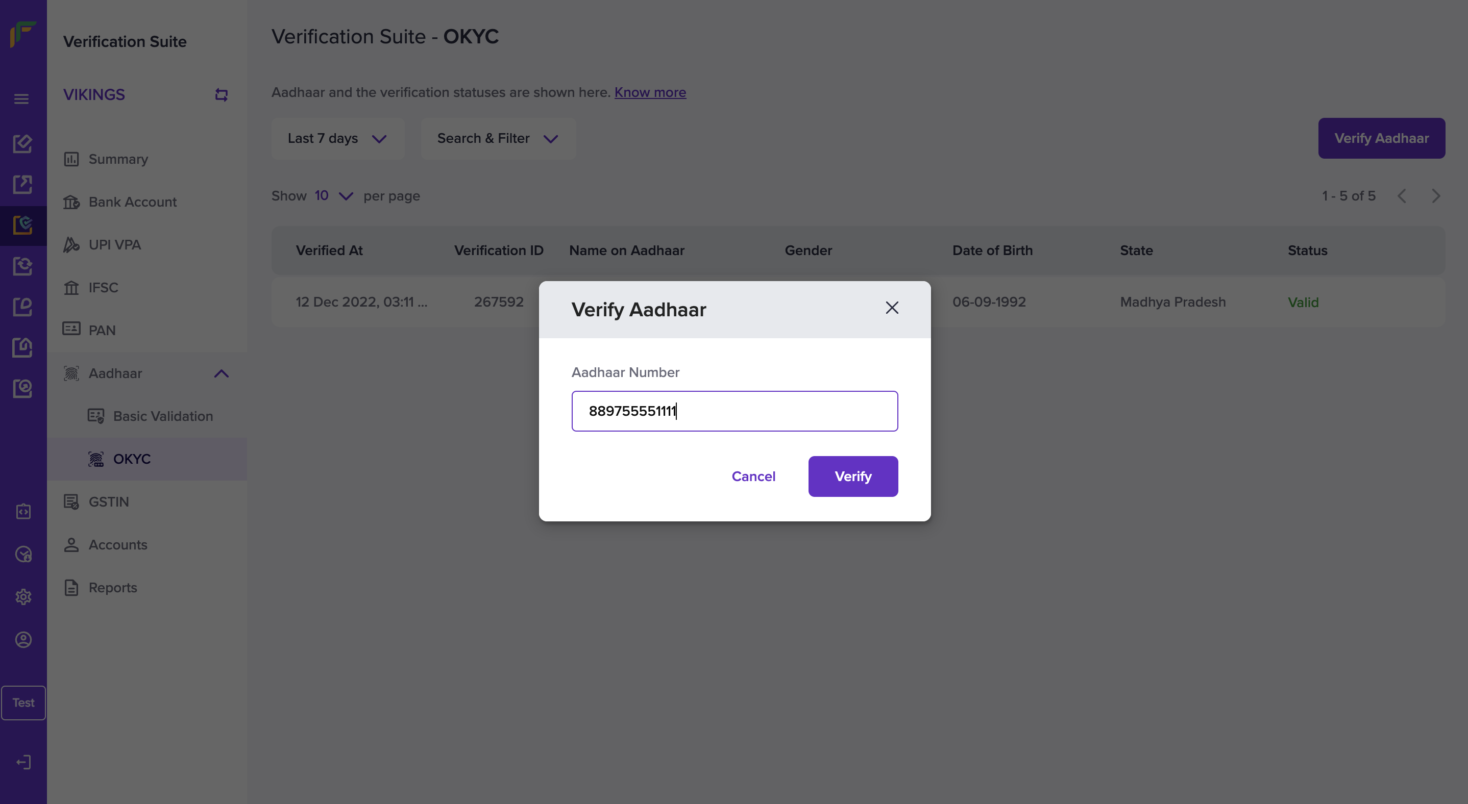 - Go to Secure ID Dashboard > Aadhaar > OKYC > click Verify Aadhaar.